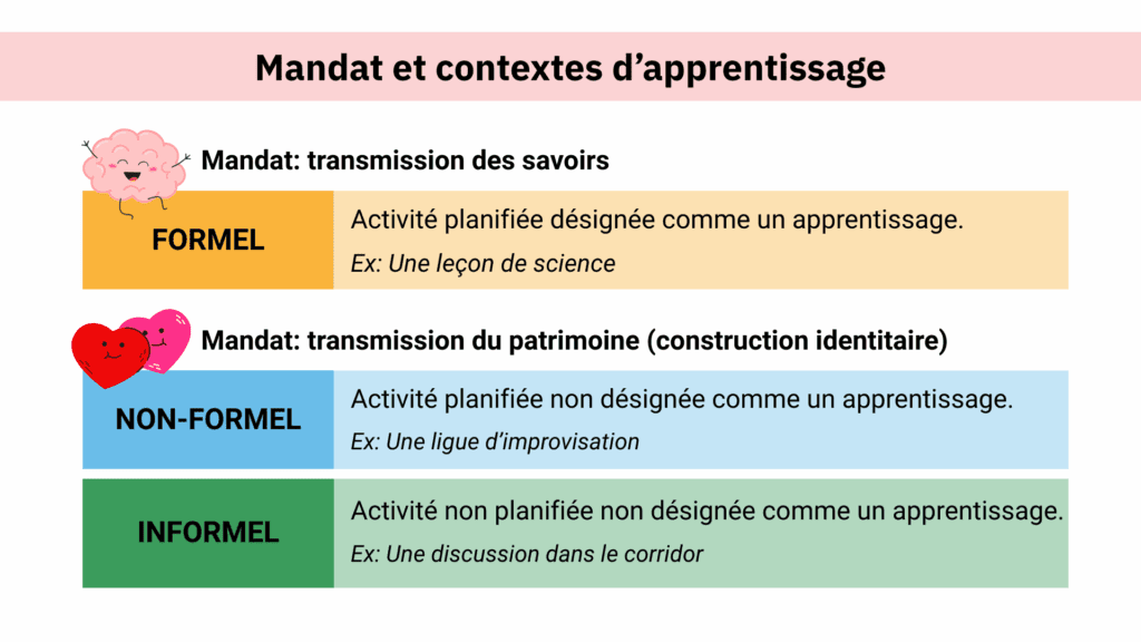 Ces questions mènent à des discussions riches chez les stagiaires. Il n’y a pas de lignes directrices qui encadrent les interactions avec les différents membres de la communauté éducative. C’est la conclusion à laquelle arrivent deux stagiaires, Takam Djambong, leader pédagogique en actualisation linguistique, et Sylvie Legault, agente pédagogique – nouveaux arrivants et anglais langue seconde, tous deux au District scolaire francophone Sud au Nouveau-Brunswick. Pourtant, ces interactions sont aussi déterminantes que le cursus éducatif. C’est grâce à elles qu’on arrive à créer les connexions sur lesquelles repose une des parties essentielles du mandat en milieu éducatif : favoriser la construction identitaire francophone. Et c’est majoritairement en dehors des contextes d’enseignements formels que ces liens essentiels se tissent.