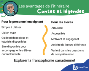 Un avantage pour toutes les personnes qui utilisent l’itinéraire Contes et légendes en classe : explorer la francophonie canadienne et découvrir la culture d’une région à travers les histoires qui y sont racontées. C’est en faisant ces découvertes que la lecture devient une véritable aventure!